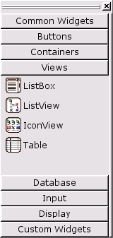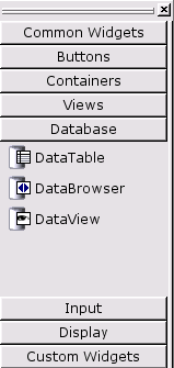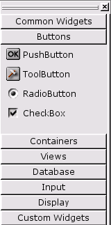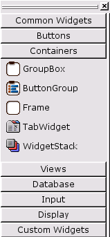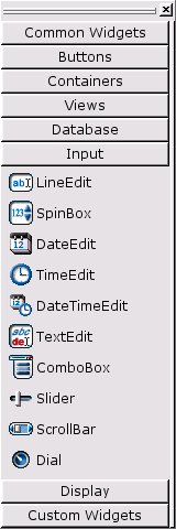 The tools toolbar buttons are available through toolbars (as they have always been prior to Qt 3.1), and also via the new Toolbox. From Qt 3.1, the tools toolbars are hidden and the Toolbox is shown. The Toolbox is divided into groups, with the first group being "Common Widgets" which contains the widgets you're likely to use most often. If you prefer to use the original toolbar setup, you can access the toolbars by clicking Windows|Toolbars and then selecting the toolbars you want to be visible from the context menu.