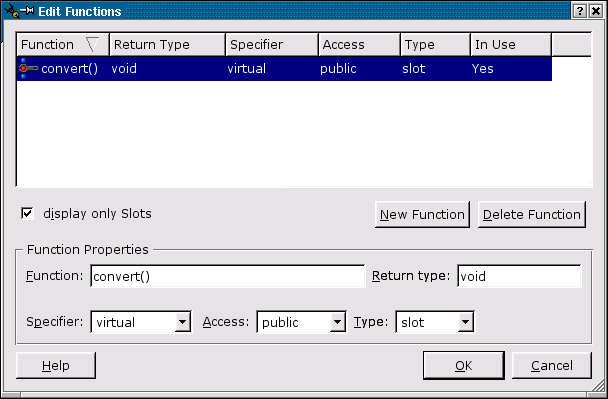 When this dialog is invoked, all existing slots and functions are shown in the listview. The column headers Function, Return Type, Specifier, Access, Type, and In Use provide details about each function that is listed. Click on any of the column headers to sort the functions. To create a new function, click the New Function button. The new function has a default name that you should replace by typing the new name in the 'Function' line edit. The 'Return Type' is also a default that can be changed by typing in the line edit. To change the 'Specifier' or 'Access', click the combobox and choose the required specifier or access. To change the type of a function (function or slot), click the Type combobox. To remove a function, click the function you want to delete, and then click the Delete Function button.