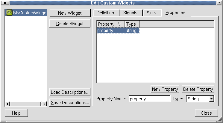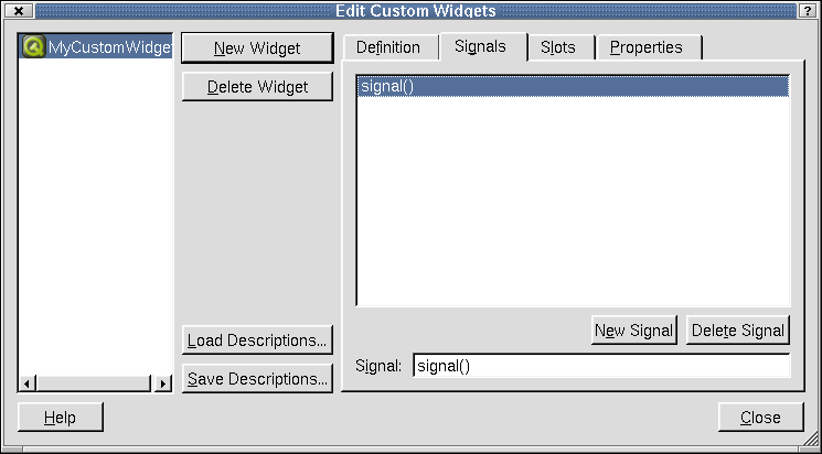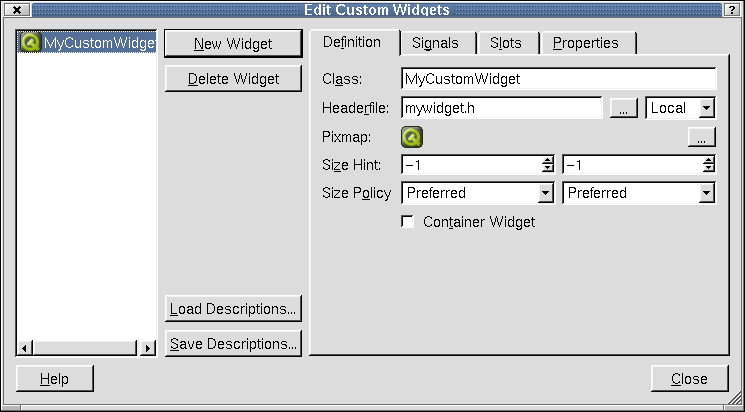 Custom widgets are created in code. They may contain a combination of existing widgets but with additional functionality, slots and signals, or they may be written from scratch, or a mixture of both. A custom widget is often a specialization (subclass) of another widget or a combination of widgets working together or a blend of both these approaches. If you simply want a collection of widgets in a particular configuration it is easiest to create them, select them as a group, and copy and paste them as required within Qt Designer. Custom widgets are generally created when you need to add new functionality to existing widgets or groups of widgets. To add create a new widget, click the New Widget button. You will find more information about adding new widgets in the 'Definitions Section'. To load a file which contains descriptions of custom widgets, click the Load Descriptions button. Clicking this button invokes the Open Dialog. To save the descriptions of the listed custom widgets, click the Save Descriptions button, which invokes the Save As Dialog. To delete a widget, click the widget in the listbox and then click the Delete Widget button.