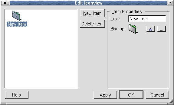 Right click or double click an iconview widget on the form and select 'Edit' to invoke the Edit Iconview dialog. Use the dialog to add, change, or remove items from the iconview. To add an item to the iconview, click the New Item button. To change the name of the item, click the 'Text' line edit and type a new name. To add a pixmap, click the (ellipsis) button, which invokes the Choose an Image Dialog. To remove a pixmap, click the Delete Pixmap button. To delete an item from the iconview, click the item and then click the Delete Item button.