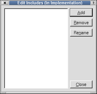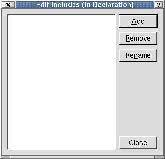 To add a new include, click the Add button. A line edit will appear for you to type the include. Press Enter after you have typed the include. To delete an include from the listbox, click the include and then click Remove. To rename an existing include, click the include and then click Rename. The cursor will appear in the line edit, allowing you to change the name.