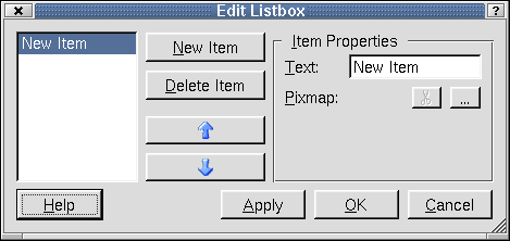 To add an item to the listbox, click the New Item. If you want to change the default name of the item, click the 'Text' line edit in the 'Item Properties' section and type a new name for the item. Click the Select a Pixmap to invoke the Choose an Image Dialog. Click a pixmap and then click the Delete Pixmap button to delete the selected pixmap. To delete an item from the listbox, click the item and then click the Delete button. To move an item up or down in the listbox, click the Move Up or Move Down buttons. Click Apply to accept the changes.