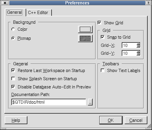 Click Edit|Preferences to invoke the Preferences dialog. This dialog has a tab for 'General' preferences. If you have the C++ Editor plugin, the dialog will also have a tab for the C++ Editor.