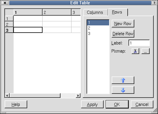 To add a row to the table, click the New Row button. To delete a row from the table, click the row you want to delete from the table, or click the row number in the 'Rows' listbox and then click the Delete Column button. To change a row's name, click the row, or the row number, and then click the 'Label' line edit and type the new text. To add a pixmap, click the (ellipsis) button, which invokes the Choose an Image Dialog. To remove a pixmap from the current row of the selected item, click the Delete Pixmap button. To move a row in the listbox, click the Move Up or Move Down buttons.