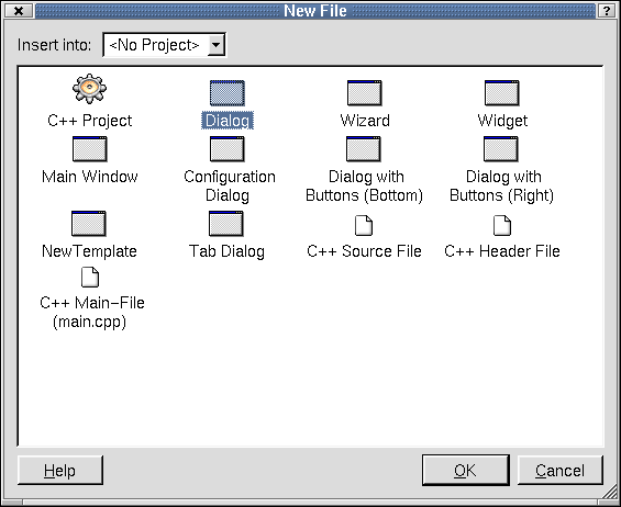 The 'Dialog' file type is highlighted by default when the New File dialog pops up. Click on the file type you want to use and click OK to create it. Click Cancel to leave the dialog without creating a new file. Note that if you select C++ Project, the 'Insert Into' combobox will be disabled, since it is not possible to insert a new C++ Project into an existing project.