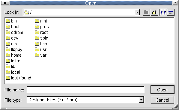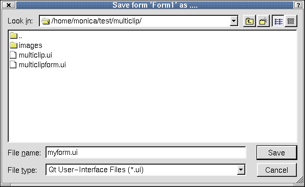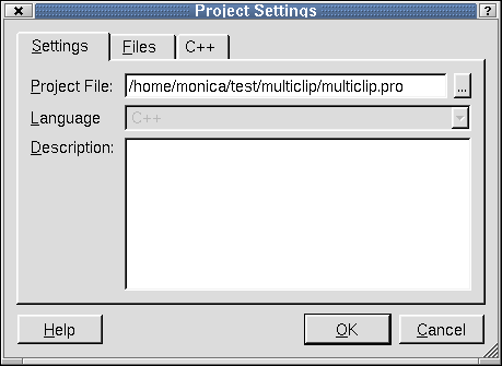Click C++ Project to start a new project. This option invokes the Project Settings Dialog. C++ projects are saved as .pro files, which include the information Qt Designer needs to manage projects. When you add a form to your project in Qt Designer, it is automatically added to the FORMS section of the project file. The .pro file contains the list of forms (.ui files) used in the project. Qt Designer reads and writes .ui files, e.g. form.ui. The uic (user interface compiler) creates both a header file, e.g. form.h, and an implementation file, e.g. form.cpp, from the .ui file.