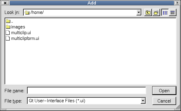Click Project|Add File to invoke the Add dialog. Use this dialog to add files to the current project.