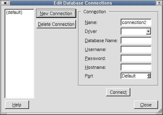 Click New Connection to create a new database connection. For applications that use a single database it will probably be most convenient to use the default connection name of '(default)'. If you use more than one database then each one must be given a unique name. A driver must be chosen from the Driver combo box. The database name may be available in the Database Name combo box or may have to be typed in. The database name, username, password and hostname should be provided by your database system administrator. When the Connection information has been completed click Connect. If the connection is made the connection name will appear in the list box on the left hand side of the dialog.