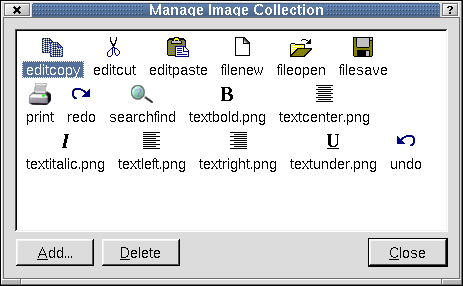 To add an image, click the Add button to invoke the Choose Images... Dialog. To delete an image from from the iconview, click the image and then click the Delete button.