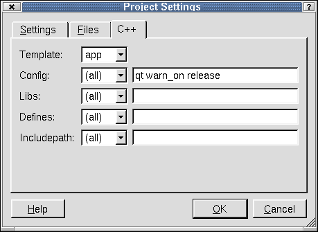 Click the C++ Tab to change the qmake options. See the qmake documentation for details on what these options mean. Click the 'Template' combobox and choose application or library to create makefiles for building applications or libraries. Click the 'Config' combobox to select the project configuration and compiler options for all platforms, or specific platforms. Type the Config value in the line edit. Note: Unix defaults to a shared library. If you want a shared library in Windows, type 'dll' at the end of the default config command and make sure you select lib from the Template combobox. Click the 'Libs' combobox to select a platform. Type the libraries in the line edit. Click the 'Defines' combobox and select a platform. 'Defines' values are added as compiler pre-processor macros. Type the 'Defines' values in the line edit. Click the 'Includepath' combobox to select a platform. Includepath specifies the directories that should be searched for include files when compiling the project. Type the 'Includepath' values in the line edit.