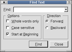 To find the text you want in a file, type the text in the 'Find' combobox. You can make the search more specific by checking any or all of the checkboxes in the 'Options' section. Click the 'Whole words only' checkbox to narrow the search to whole words. Click 'Case Sensitive' to search for text that is identical to the text typed in the combobox. Click 'Start at Beginning' to start the search from the beginning of the file. The 'Direction' section offers the 'Forward' radio button and the 'Backward' radio button to specify the direction to perform the search in the file. Click the Find button to start the search. When the text is found, it is highlighted in the file. Continue clicking Find to search for subsequent occurrences of the search text.