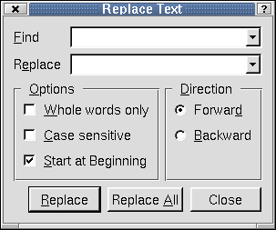 To replace text, type the text you would like to replace in the 'Find' combobox. Type the new text in the 'Replace' combobox. You can make the search more specific by checking any or all of the checkboxes in the 'Options' section. Click the 'Whole words only' checkbox to narrow the search to whole words. Click 'Case Sensitive' to search for text that identical to the text you typed in the combobox. Click 'Start at Beginning' to start the search from the beginning of the file. The 'Direction' section offers the 'Forward' radio button and the 'Backward' radio button to specify the direction to perform the search in the file.