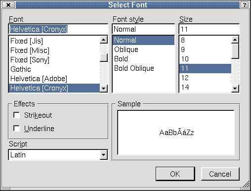 Click the 'Font' listbox to choose a font type. The current selected type appears in the line edit above the 'Font' listbox. Click the 'Font Style' listbox to choose a style for the font. The choices available in the listbox are limited to the type of font you choose. Not all fonts have all styles available. The selected style appears in the line edit above the 'Font Style' listbox. Click the 'Size' listbox to choose a size for the font. The current selected size appears in the line edit above the 'Size' line edit. Click the checkboxes in the 'Effects' section to create a 'Strikeout' or 'Underline' effect for the selected font. Click the 'Script' and choose a style of writing. View your font selections and styles in the 'Sample' listbox.