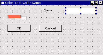 Click the TextLabel tool again, then click to the right of the colorLabel, towards the top of the form. Change the text property to "&Name". Note that the ampersand is displayed; this is because a QLabel cannot accept focus and we haven't specified a focus widget ("buddy") yet.
