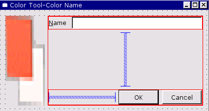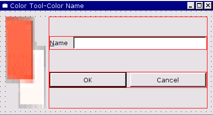 We will lay out the "Name" label and the line edit side by side. Then we'll do the same for the buttons, and finally we'll lay out these two layouts in relation to the colorLabel.