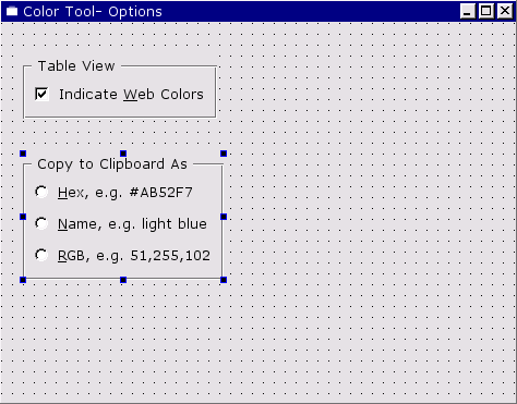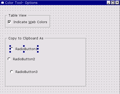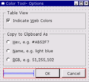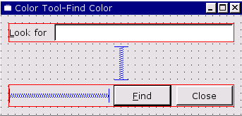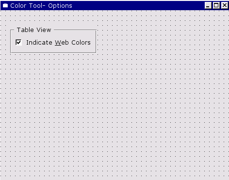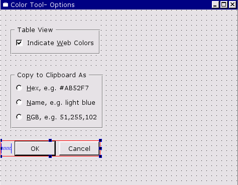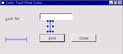 Click File|New to invoke the New File dialog, then click "Dialog", then click OK. Drag a corner of the new form to make it a lot smaller. Change the form's name (in the Property Editor) to "ColorNameForm", and change its caption to "Color Tool -- Color Name". Click File|Save, then click Save to save it.