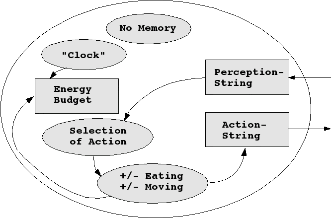 Bezüglich des Gedächtnisses ('memory') wird angenommen, dass dieses zu Beginn keine Funktion hat. Es gibt aber zwei Systemzustände, die von Bedeutung sind: die Energiebilanz ('energy budget') sowie die (innere) Uhr ('clock'). Die Uhr steht für ein periodisches Ereignis, das zur Steuerung von Prozessen genutzt werden kann. Ein solcher Prozess ist die Veränderung der Energiebilanz. Die Energiebilanz vermindert sich in Abhängigkeit von der Zeit ('energy--') wie auch in Abhängigkeit von Bewegungen. Erhöht werden kann sie nur ('energy++') durch Nahrungsaufnahme, sprich durch eine Aktion essen ('eat').