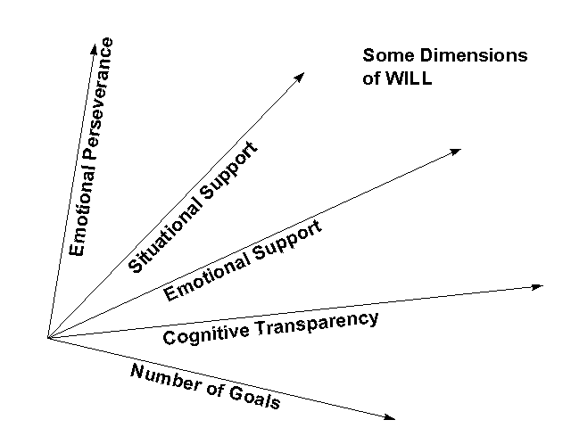 DES WOLLENS). Der Wille ist also eine komplexe Funktion, die bestimmte komplexe Ausgangsgrößen in realisierte Handlungseinheiten R'' abbildet: WILL: WM x ASSOC x META x DR/EM/FE x S'' x BODY x R'' ---> R'' Jeder Agent hat seinen eigenen individuellen Werteverlauf bei dieser Funktion. Allgemein kann man nur sagen, welche Faktoren grundsätzlich ein 'effektives selbstkongruentes' Wollen behindern, z.B.: