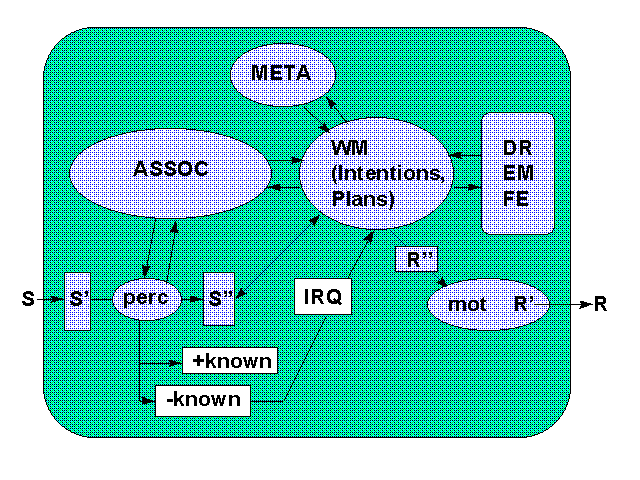 aktuellen Zielen G. Das Arbeitsgedächtnis steht außerdem in einer dichten Beziehung zu den aktuellen Trieben [DR := DRIVES], Emotionen [EM := EMOTIONS] bzw. Stimmungen [FE := FEELINGS]. Diese können sich auf die Bewertungsstruktur der aktuellen Ziele G auswirken bzw. auf die Konstruktion der Ziele auf der Basis von ASSOC selbst. Zugleich ist es aber auch so, daß aktuelle Handlungen sich auf die Triebe DR direkt auswirken können, ebenso auf die Emotionen EM und die Stimmungen FE; Emotionen und Stimmungen können aber auch von aktivierten Strukturen aus ASSOC direkt beeinflußt werden. Parameter, die das Arbeitsgedächtnis charakterisieren, sind z.B. die Anzahl der aktuellen Ziele, ihre Komplexität, ihre Wichtigkeit, wie angenehm sie sind, usf. Zur Überwachung der Adäquatheit der aktuellen Ziele dienen neben der assoziativen Struktur ASSOC sowohl die aktuellen Wahrnehmungen S'' sowie mögliche Unterbrechungsanforderungen IRQ. Im Falle von Unterbrechungsanforderungen IRQ kann die aktuelle Zielabarbeitung unterbrochen werden. In diesem Fall werden die Ressourcen benutzt, um die aufgetretene Unklarheit gezielt zu bearbeiten (gezielter Wahrnehmen, mehr Nachdenken, zusätzliche Aktionen). Das Gelingen bzw. Mißlingen der Aufklärungsarbeit kann die emotionalen Faktoren - speziell EM, FE - direkt beeinflussen |
