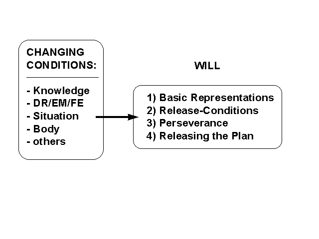 DES WOLLENS). Der Wille ist also eine komplexe Funktion, die bestimmte komplexe Ausgangsgrößen in realisierte Handlungseinheiten R'' abbildet: WILL: WM x ASSOC x META x DR/EM/FE x S'' x BODY x R'' ---> R'' Jeder Agent hat seinen eigenen individuellen Werteverlauf bei dieser Funktion. Allgemein kann man nur sagen, welche Faktoren grundsätzlich ein 'effektives selbstkongruentes' Wollen behindern, z.B.: