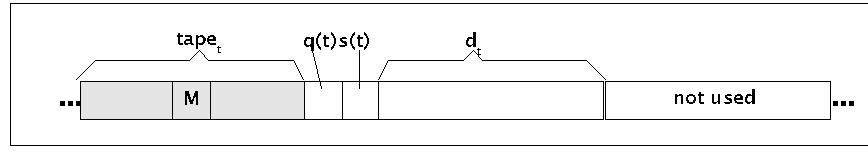 Irgendwo auf dem Band steht die Beschreibung der zu simulierenden Turingmaschine dt. Direkt links davon steht der aktuelle Zustand q(t) von dt sowie das aktuelle Symbol s(t). Links davon beginnt das Band der zu simulierenden Turingmaschine t. Irgendwo dort -zu Beginn auf dem ersten Zeichen von links der Eingabe für die dt- gibt es die Marke 'M'; sie signalisiert die aktuelle Position des Lese-Schreib-Kopfes der dt.